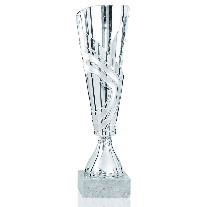 Budget line trophy in silver color with plastic parts and marble base. An ideal award for the second-place winner.