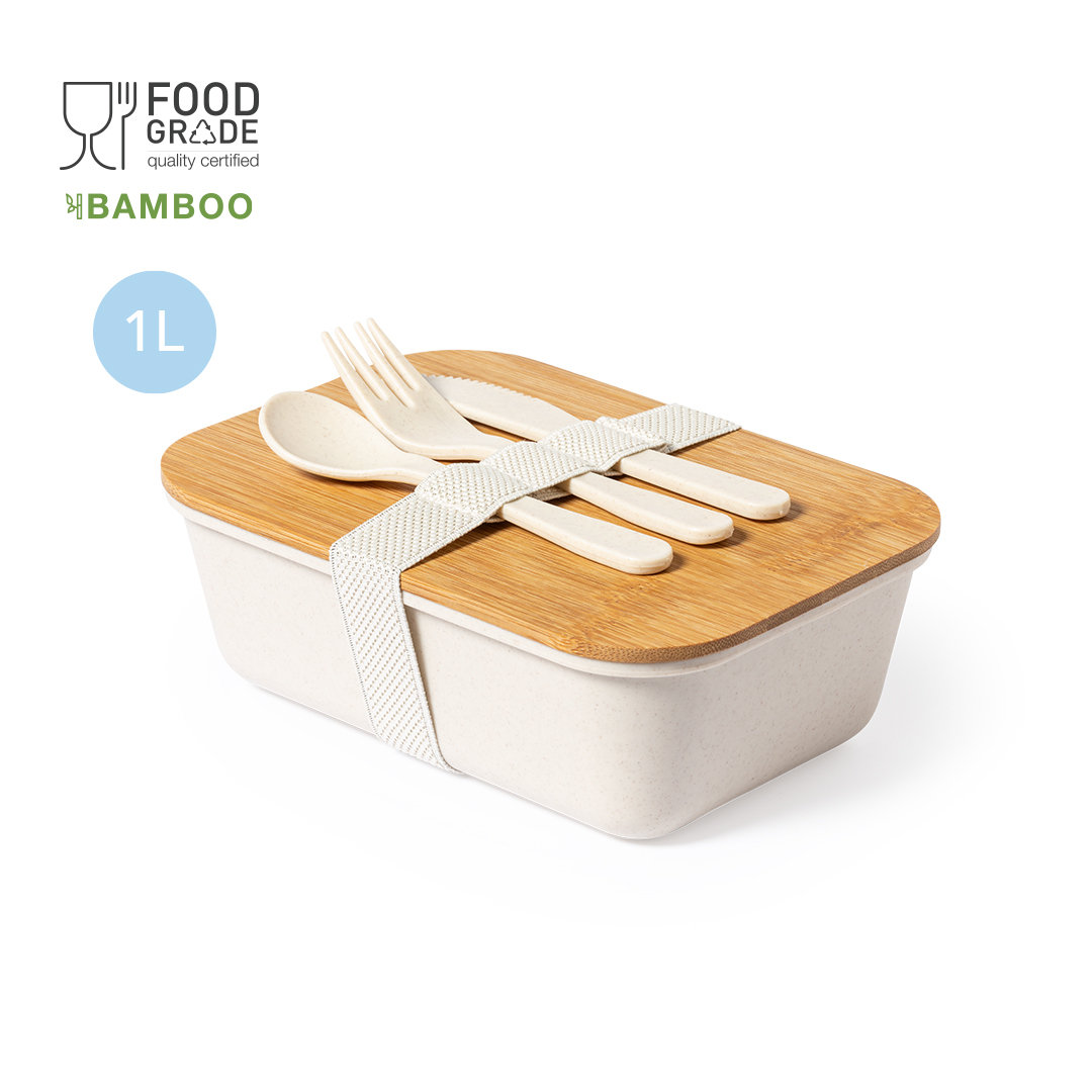 Lunch box made of BPA-free veined PP, with bamboo lid and 1l capacity. Safety elastic band closure, with compartments for fork, spoon and knife (included).