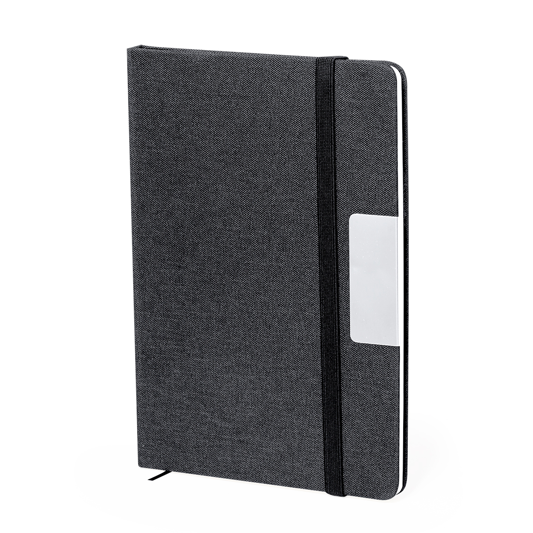 RPET notepad in an elegant black colour, with a special metal late for laser engraving. Including an elastic closure and a fabric bookmark. Interior with 80 sheets of single-striped layout. With the RPET logo.