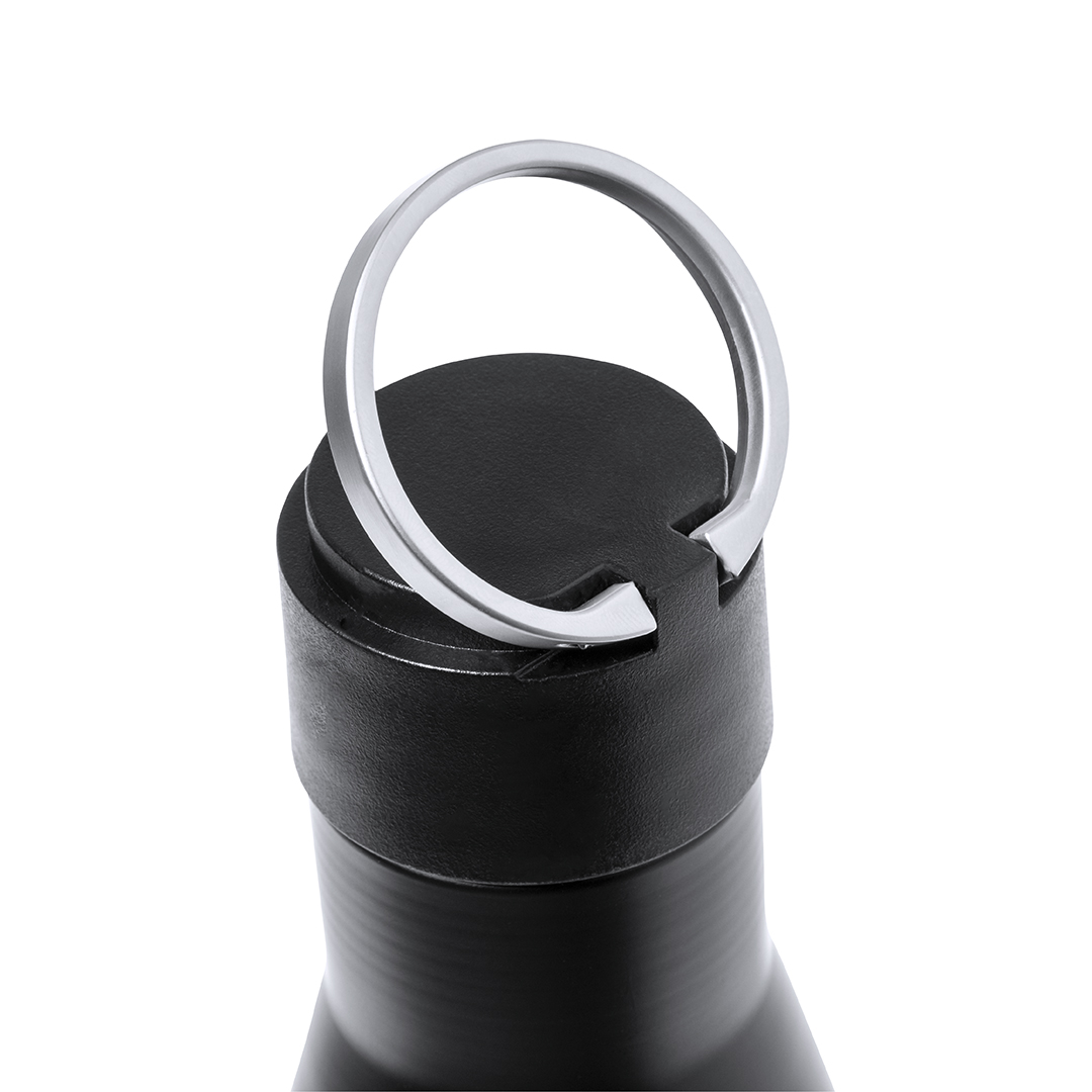 500 ml capacity, double-layer flask made in Recycled Stainless Steel with matte black finish, and rigid handle in matte silver metal. With a stainless steel logo.