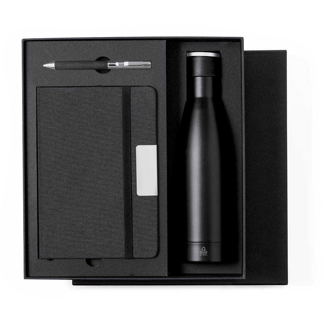 Insulated Bottle Recycled Stainless Steel, 500 ml. Notepad Polyester 300D RPET, Hard Cover, 80 Sheets. Polyester 300D RPET Pen Included
