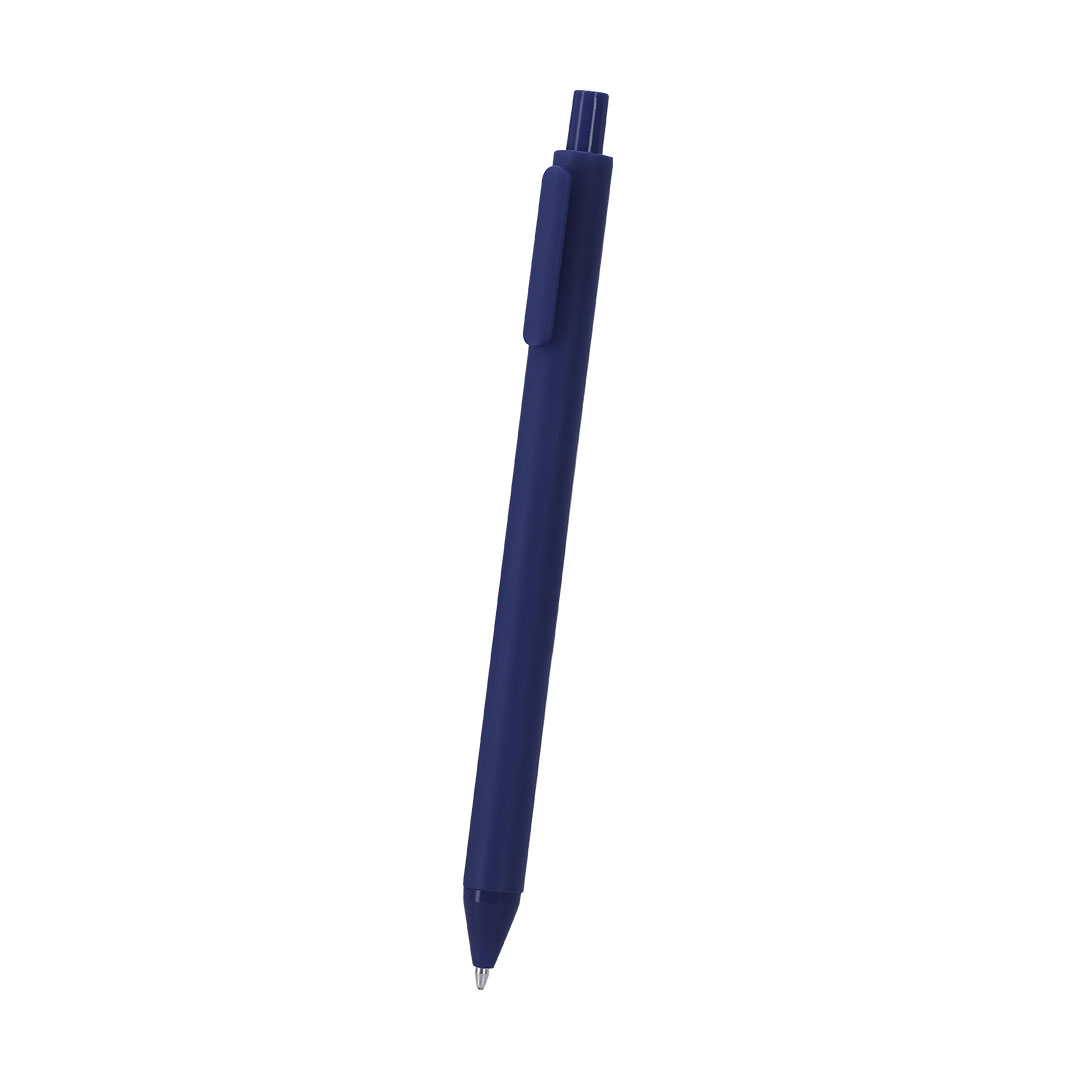 – Pen, with a solid color body in a rubber finish. It has a clip, push-button mechanism, and blue ink.