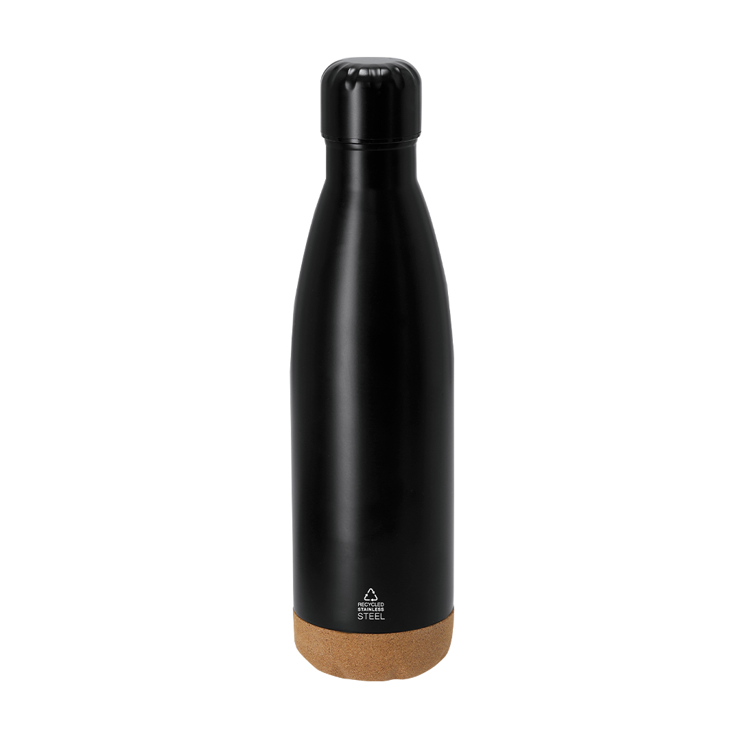 – Recycled Stainless Steel thermal drum with a capacity of 500ml, with cork base design. Screw cap. With a distinctive Recycled Stainless Steel logo.