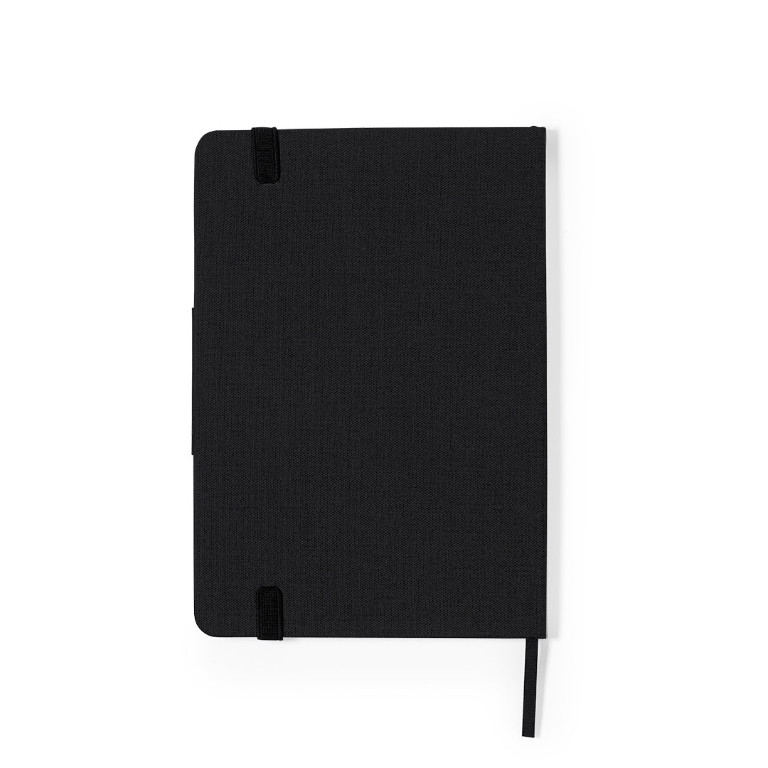 RPET notepad in elegant black, with special metal detail for laser branding. Including elastic bands and fabric bookmark. Inside with 80 sheets, single-stripe layout. With RPET logo.