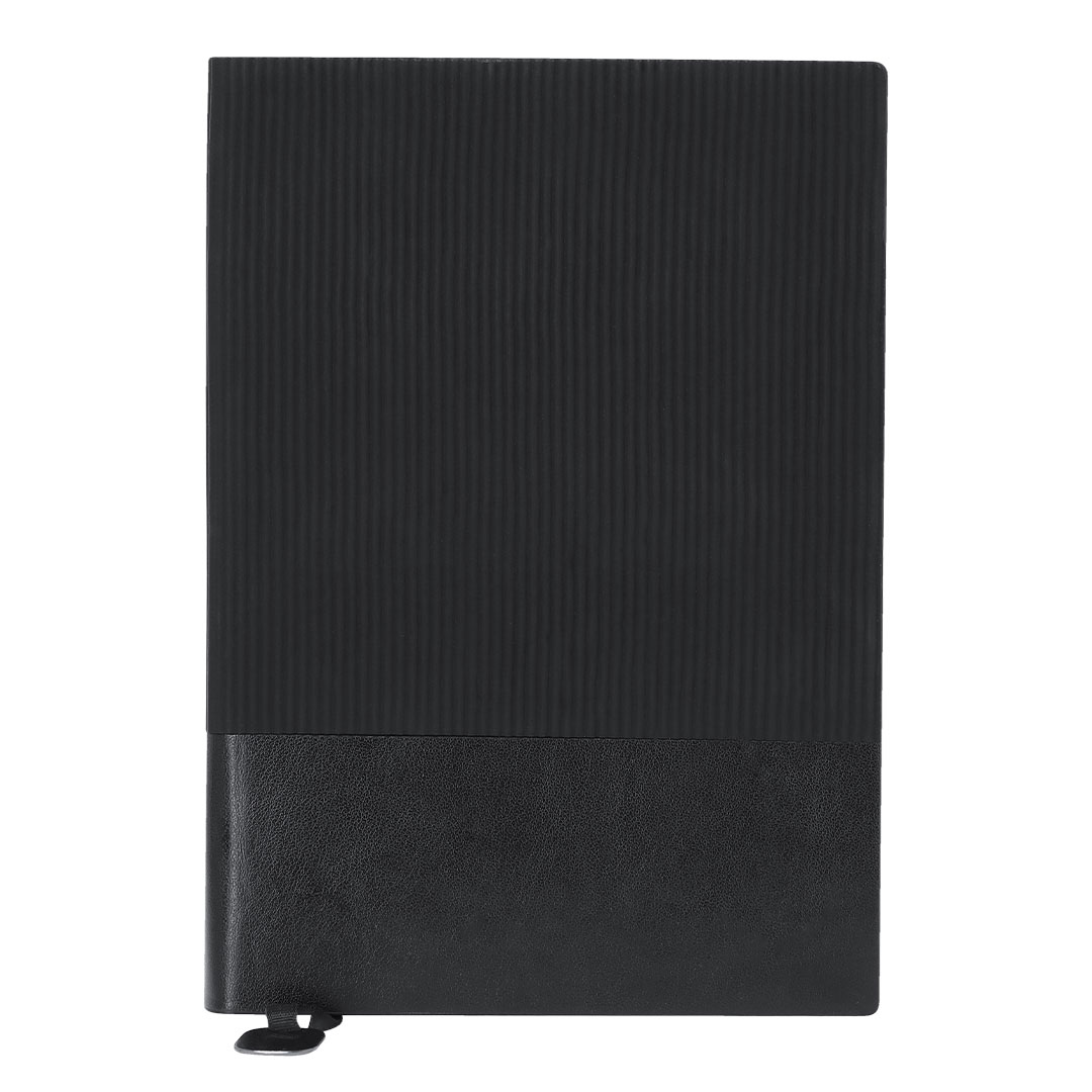 Soft cover notepad made of smooth PU leather in an elegant black colour, combining smooth and bevelled textures. Including a fabric bookmark and a special metal plate for laser engraving. Inside with 100 sheets, in cream colour, with single-striped layout and black edges.