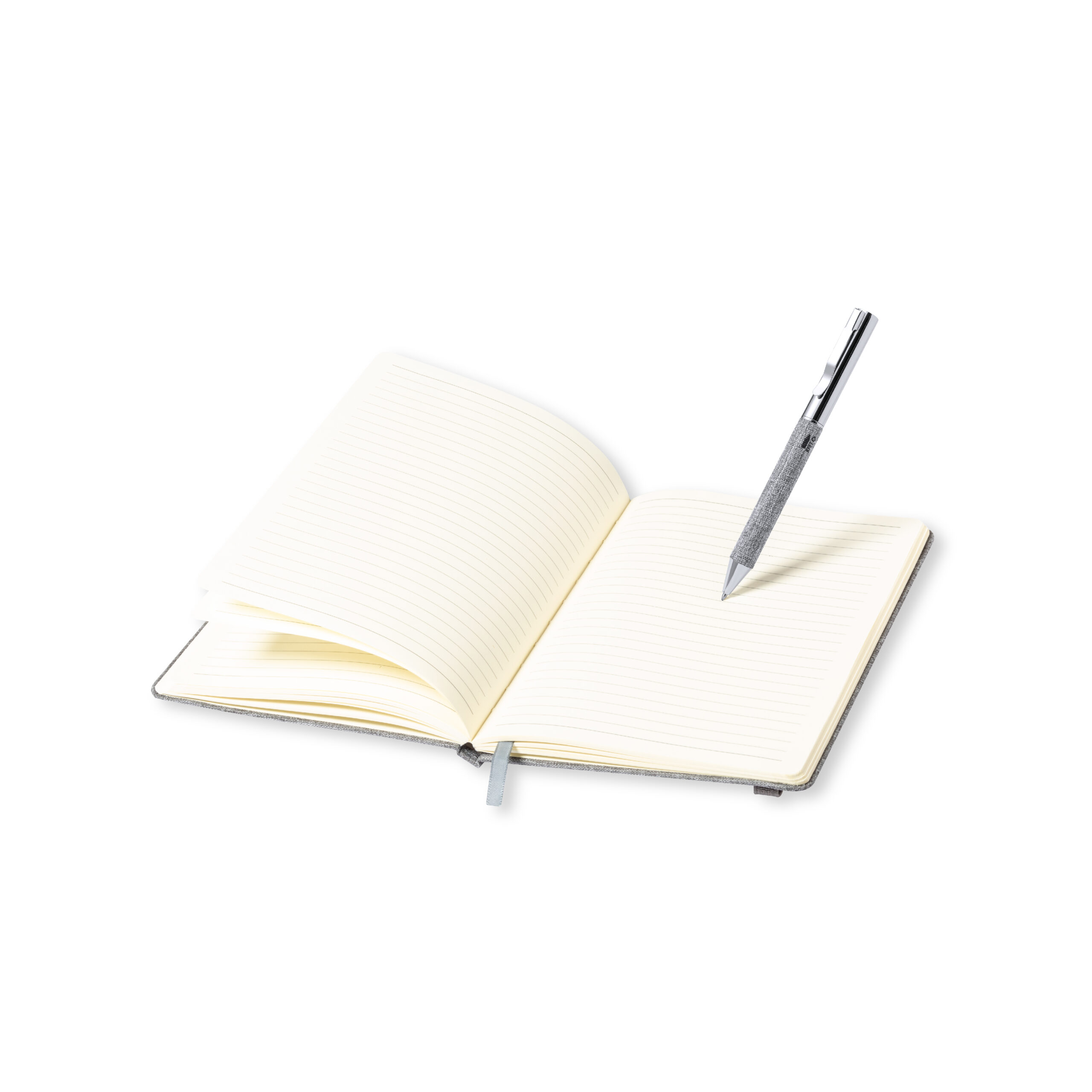 Hard cover notepad, with metal insert on front cover, fabric bookmark and matching elastic binding. 100 sheets inside with striped layout and RPET distinctive at the back cover.