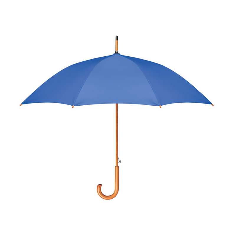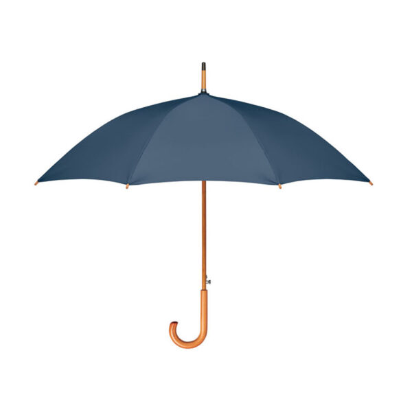 23 inch auto open umbrella in 190T RPET pongee with wooden shaft, tips and top. Black plated metal ribs. Curved natural finish wooden handle. Manual closure. Winter. womens day